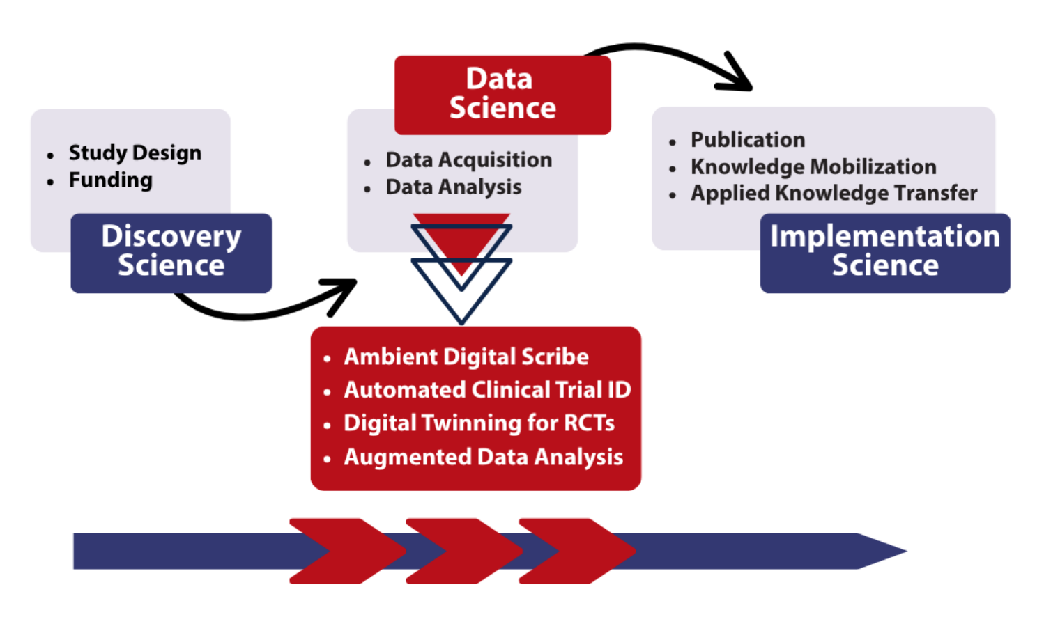 - The inner blue layer features the research pillars: Biomedical, Clinical, Population Health, and Health Services